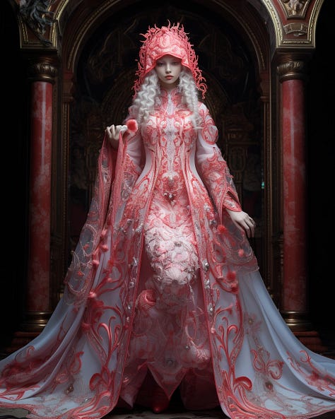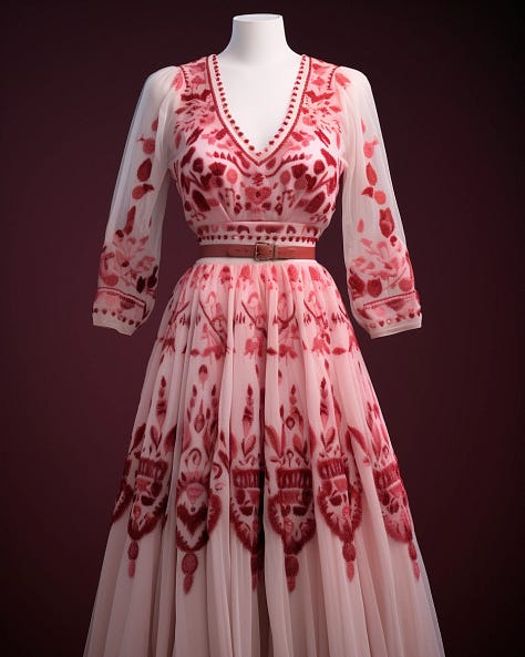 On the other hand, I am quite impressed with AI as a visual platform. Although it surprises me when it takes my direction somewhere I don’t think it should go. For example, I started with a Dolce & Gabbana dress. Then AI went down an interesting path. Some of the solutions are so beautiful.